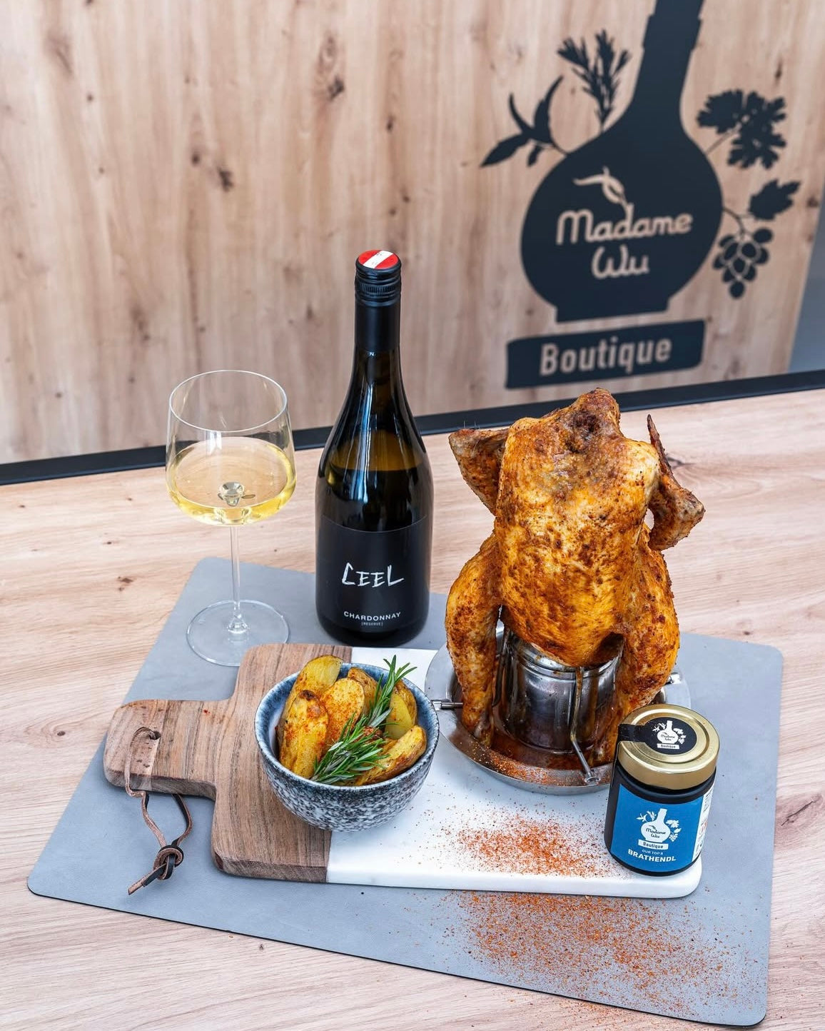 Ein Hähnchen, das mit Weißwein und ganz viel Liebe zubereitet wird.