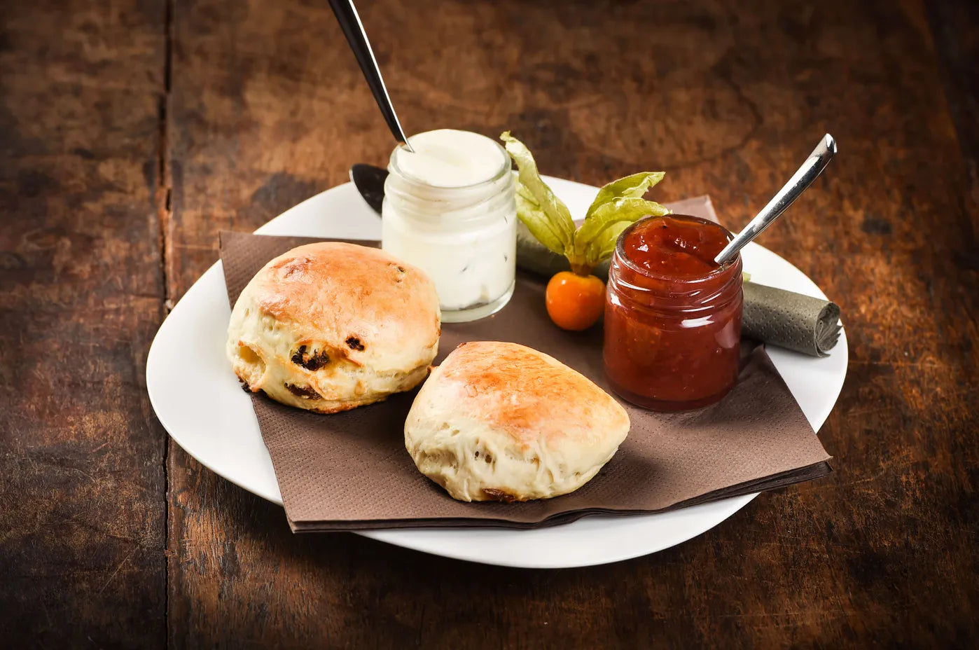 mit hausgemachter Erdbeermarmelade und Clotted Cream.