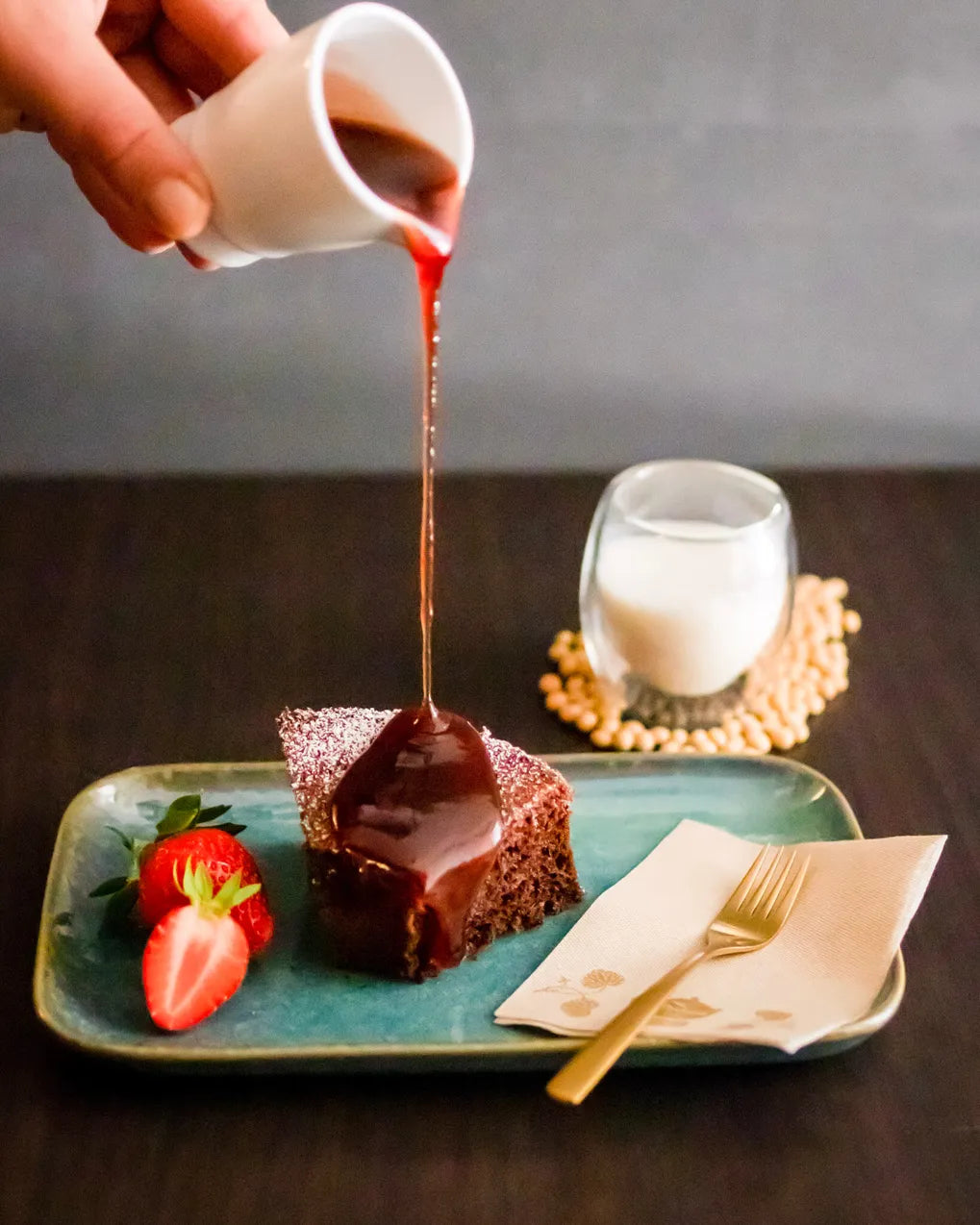 aus hausgemachter Sojapaste gluten- und laktosefrei. Wahlweise mit Schlagobers und/oder Erdbeersauce.