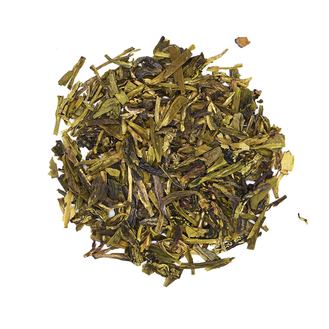 Ein chinesischer grüner Tee mit langen, flach gepressten Blättern und klarem mildem Geschmack. Bittert nicht nach und eignet sich für jedes Wasser. Aus kontrolliert biologischem Anbau. Hellgrüner Aufguss.