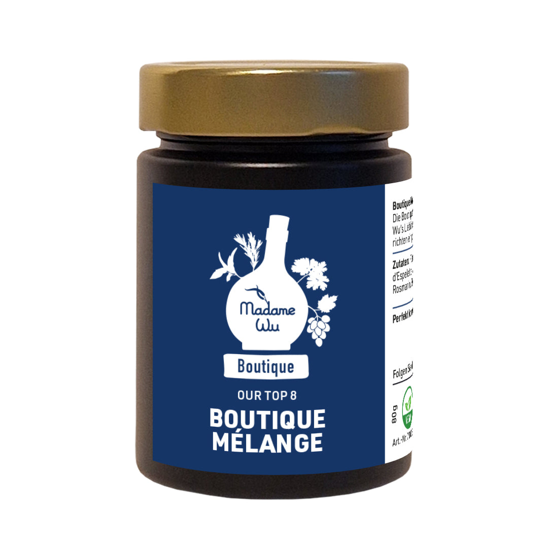 Die Boutique Melange ist eine einzigartige Komposition aus vielen von Madame Wu's Lieblingszutaten. Raffiniert kombinierte Aromen verleihen fast allen Gerichten ein pefektes Finish und sorgen so für einen absoluten Wow-Effekt. Zutaten: Fleur de Sel, Sumac, brauner Zucker, Paprika geräuchert, Piment d'Espelette, Asafoetida, Senfkörner , Ajowan, Fenchel, Sellerie, Thymian, Rosmarin, Bockshornklee