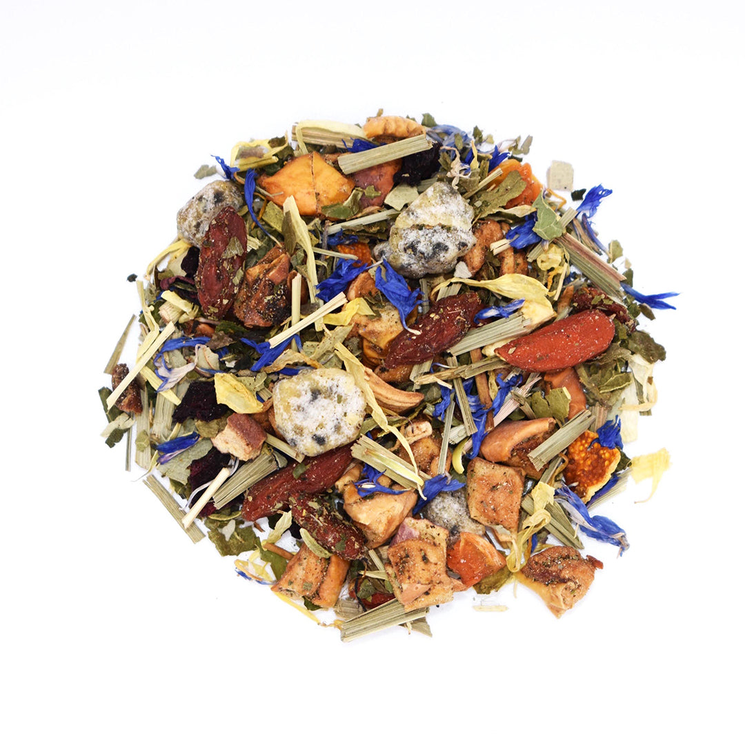 Harmonisierende Kräuterteemischung mit fruchtigem Geschmack nach Drachenfrucht und Gojibeeren. Zutaten: Apfelstücke, Gojibeeren, Drachenfruchtstücke (Drachenfrucht, Zucker), Zitronengras, Brombeer- und Brennnesselblätter, Orangenschalen, Eukalyptusblätter, Karottenflocken, natürliches Aroma, Kornblumen, Ringelblumen