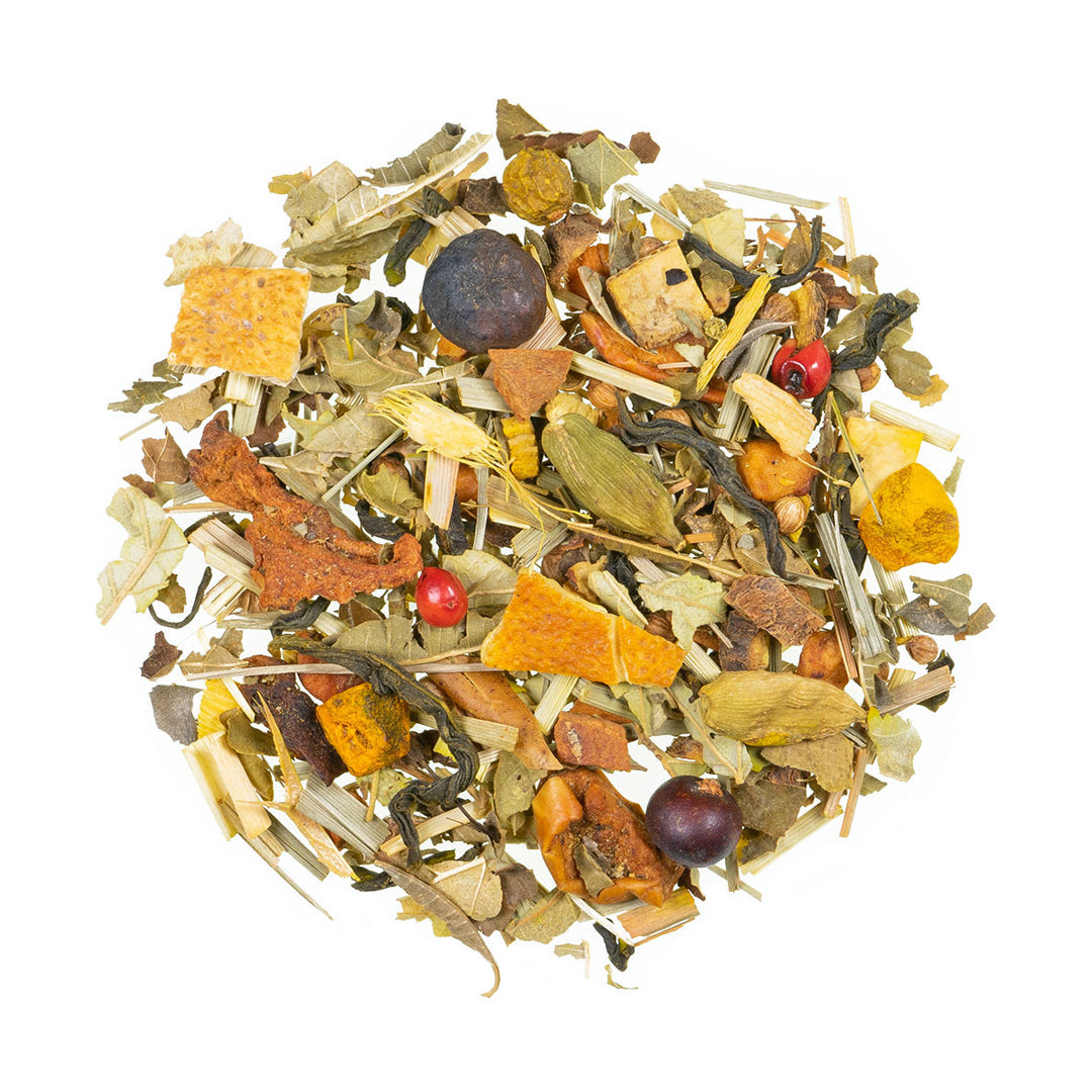Botanicals wie Zitronen- und Orangenschalen sowie rosa Pfeffer machen aus diesem Wacholderbeeren-Tee