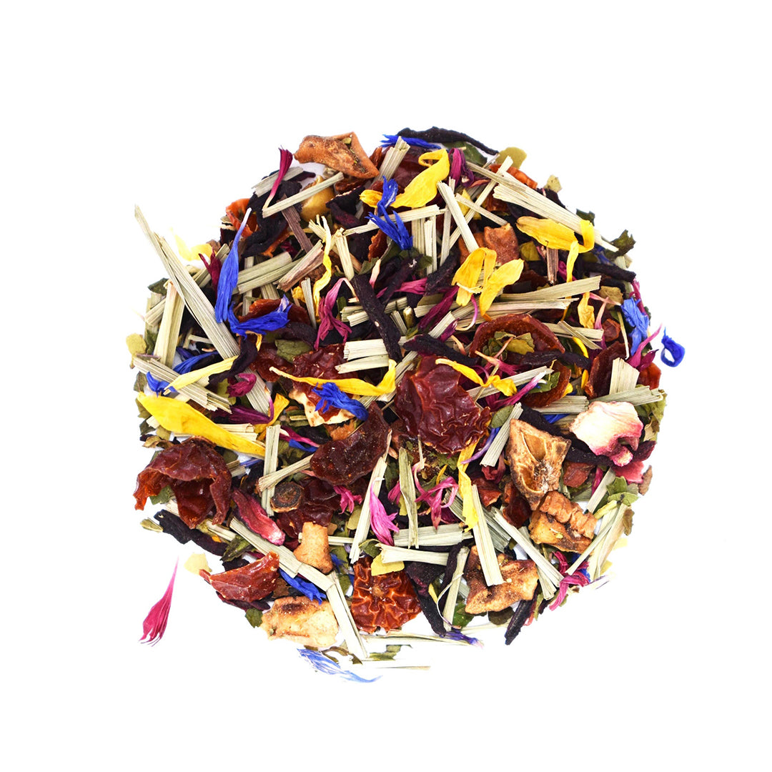 Mit guter Laune durch den Tag - dank energetisierenden Matetee, erfrischender Pfefferminze und kunterbunten Blütenblättern. Zutaten: Apfelstücke, Hagebutten, Mate grün (koffeinhaltig), Hibiskus, Lemongras, Pfefferminze, Süßkraut, Kornblumen rot und blau.