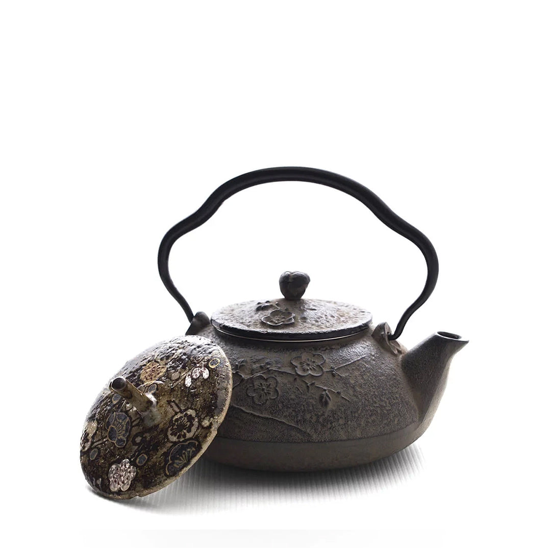 Diese dekorative Teekanne ist aus Gusseisen gefertigt und innen emailliert. Im Preis inbegriffen sind ein herausnehmbares Edelstahlsieb und zwei Deckel. Davon einer aus Kyoto-Keramik und der anderen aus Gusseisen.