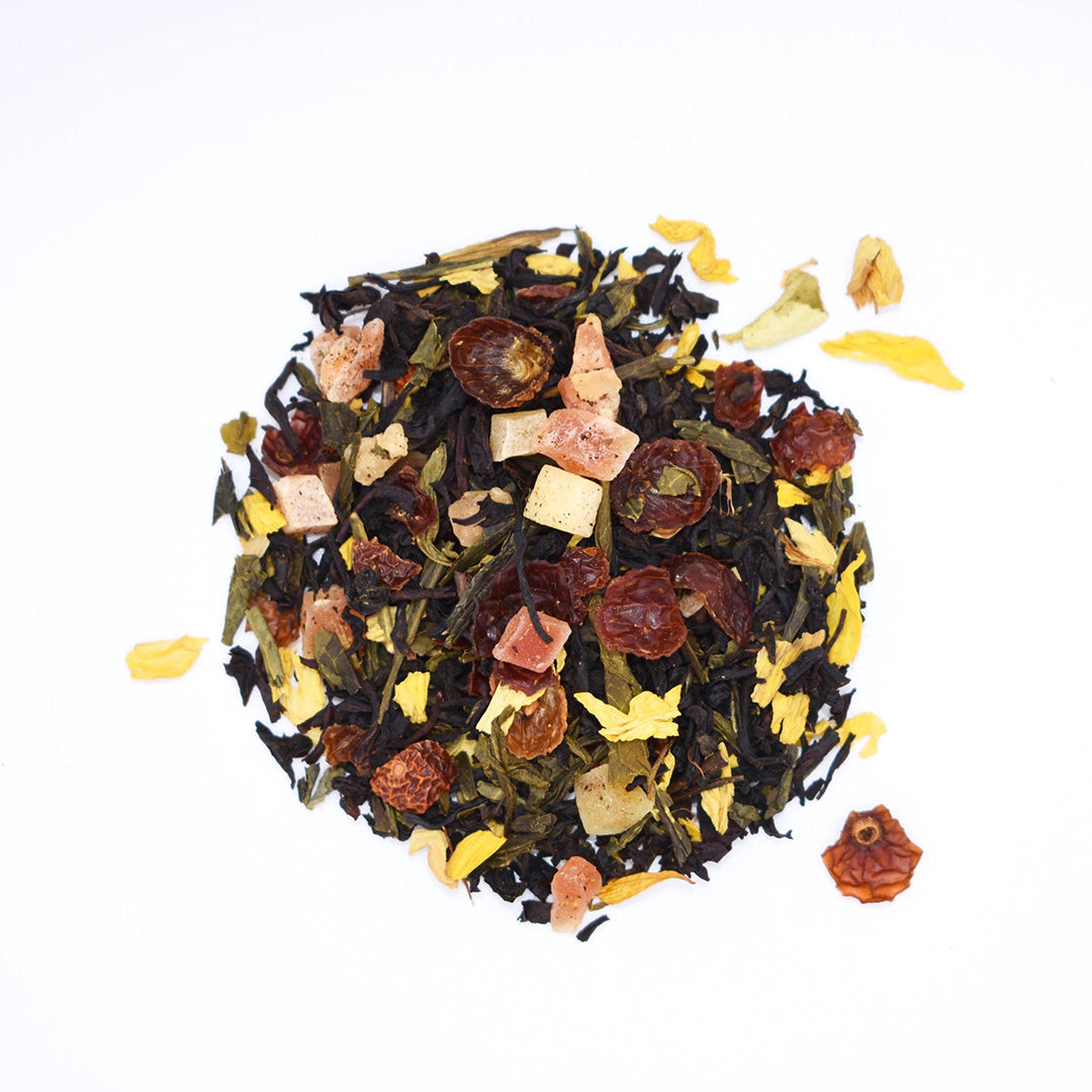 Zusammenspiel mit der feinen Säure der intensiv rot-leuchtenden Hagebuttenschale. Zutaten: schwarzer Tee, grüner Tee, Papayawürfel (Papaya, Zucker), Hagebuttenschalen, Aroma, Sonnenblumenblüten.