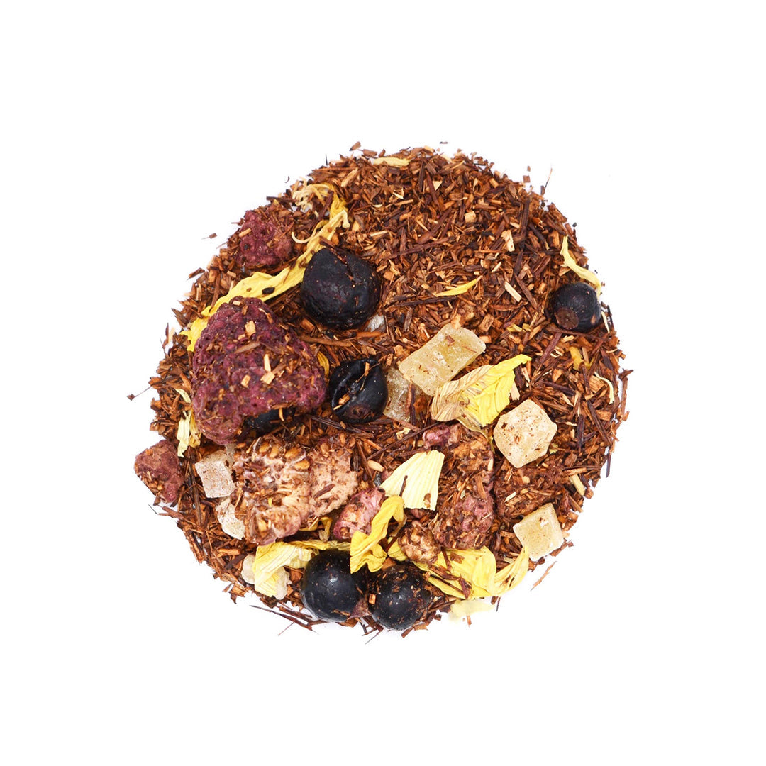 Ein Rooibostee mit schwarze Johannisbeer-Himbeer-Geschmack. Zutaten: Rooibos, kandierte Ananas, kandierte Papaya, kandierte Mango, schwarze Johannisbeeren, Erdbeer, Aroma, Sonnenblumenblüten