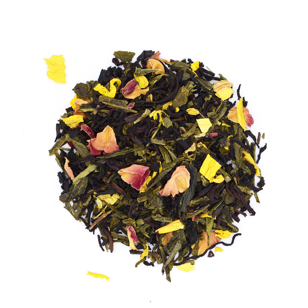 Diese erlesene Mischung aus feinsten schwarzen und grünen Tees wird durch besondere Aromen veredelt. Zutaten: schwarzer Tee, grüner Tee, Aroma, Rosenblüten, Sonnenblumenblüten
