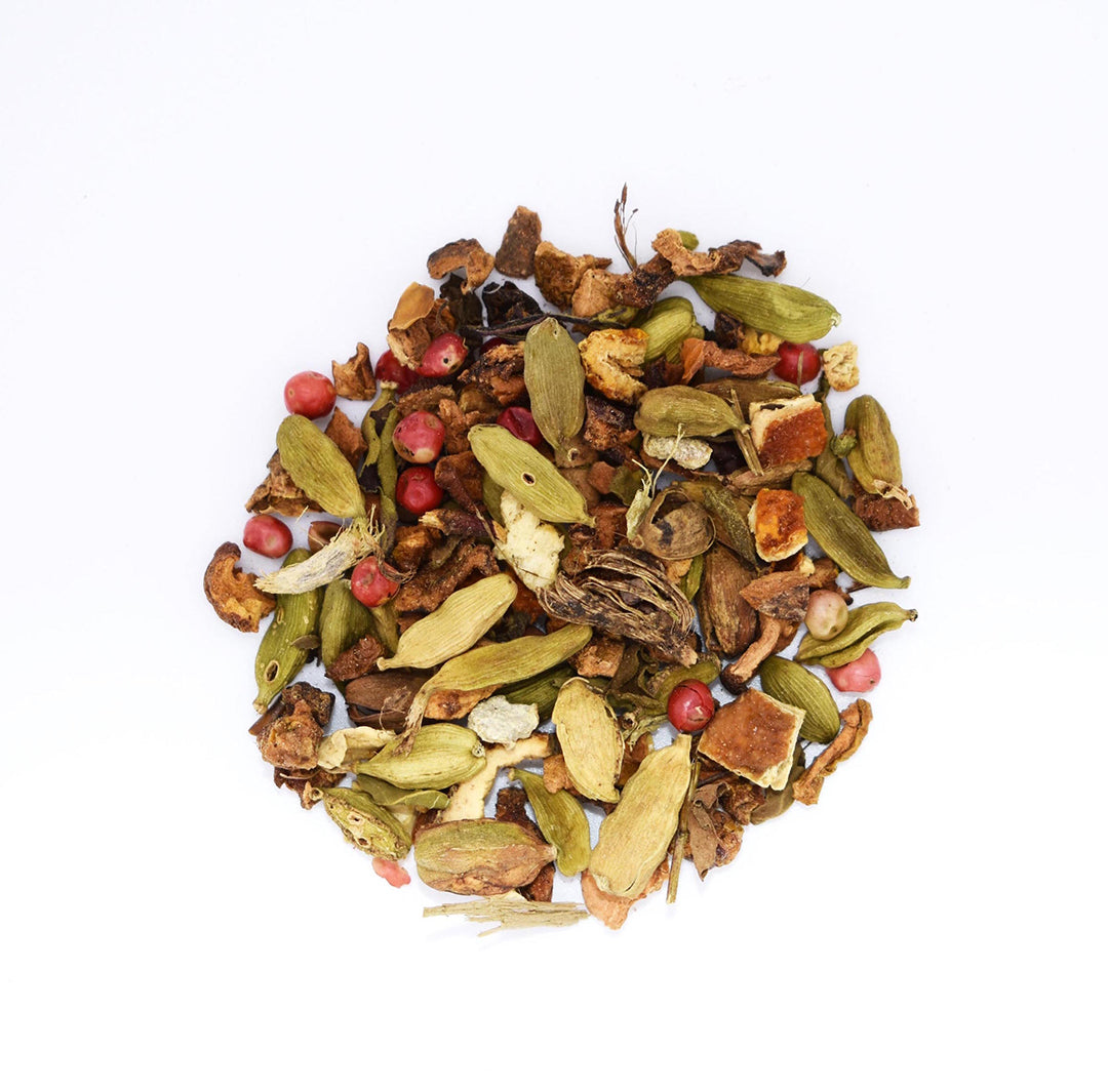 Würzige ayurvedische Kräuter-Rooibos-Mischung mit Orange-Ingwer-Geschmack.