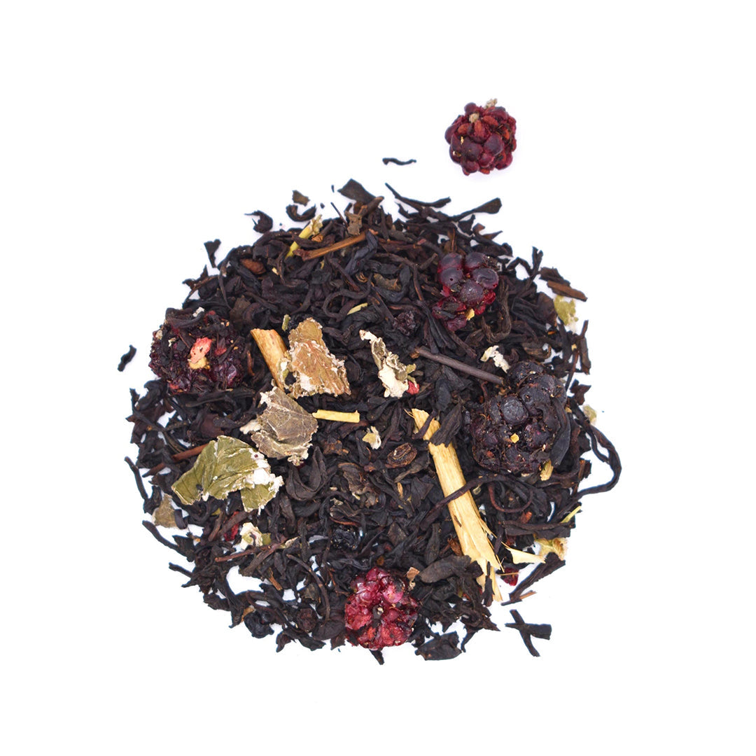 Ausgesuchte Früchte geben diesem Schwarztee eine geschmackliche beerige Dekoration. Zutaten: schwarzer Tee, Aroma, Fliederbeeren, gefr.- getr. ganze Brombeeren, Himbeerblätter, Himbeerstücke