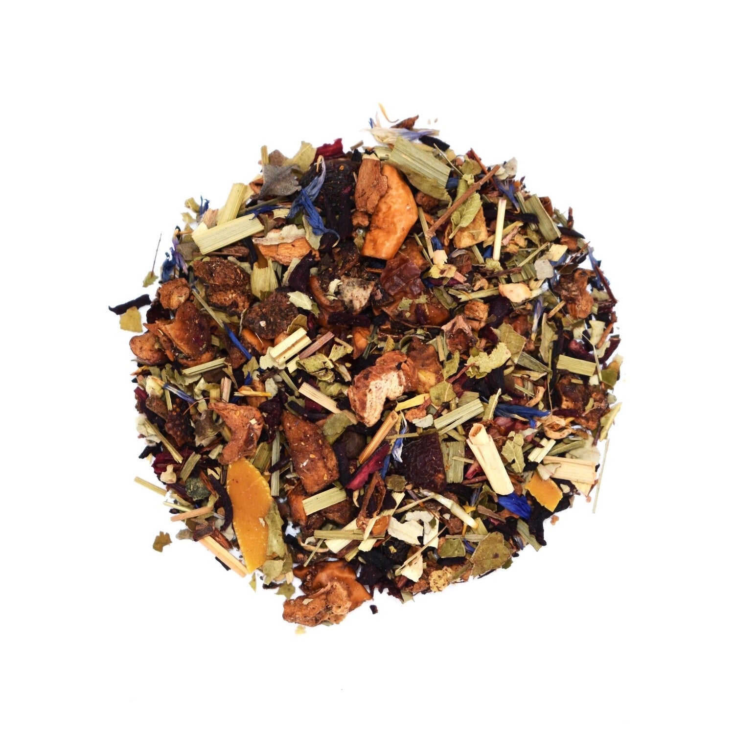 Zutaten: Apfelstücke, Hibiskusblüten, Hagebuttenschalen, Orangenschalen, Lemongras, Brombeerblätter, Weinbeeren, Aroma, Rooibos, Mandelflakes, Verbenenkraut, Silberlindenblüten, Sternanis, Zimtrinde, Kornblumenblüten, Vanillestücke, Nelken